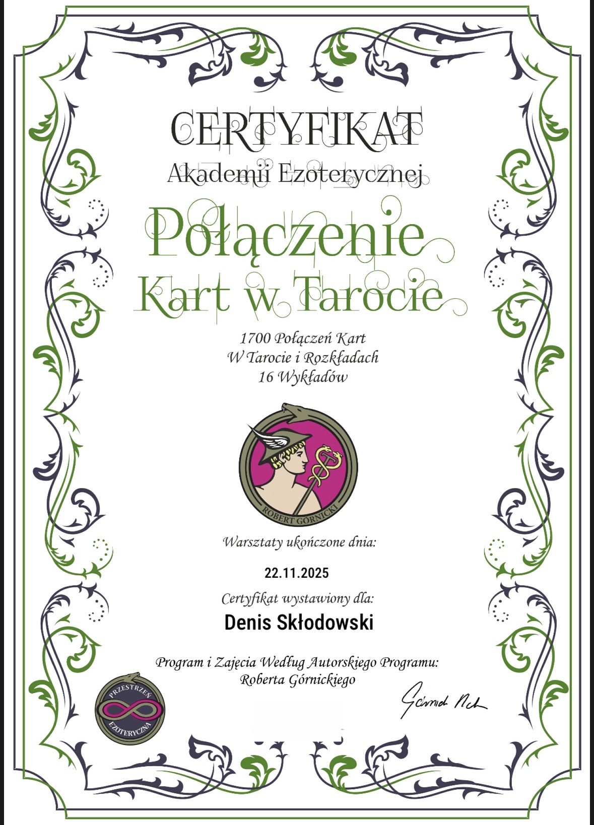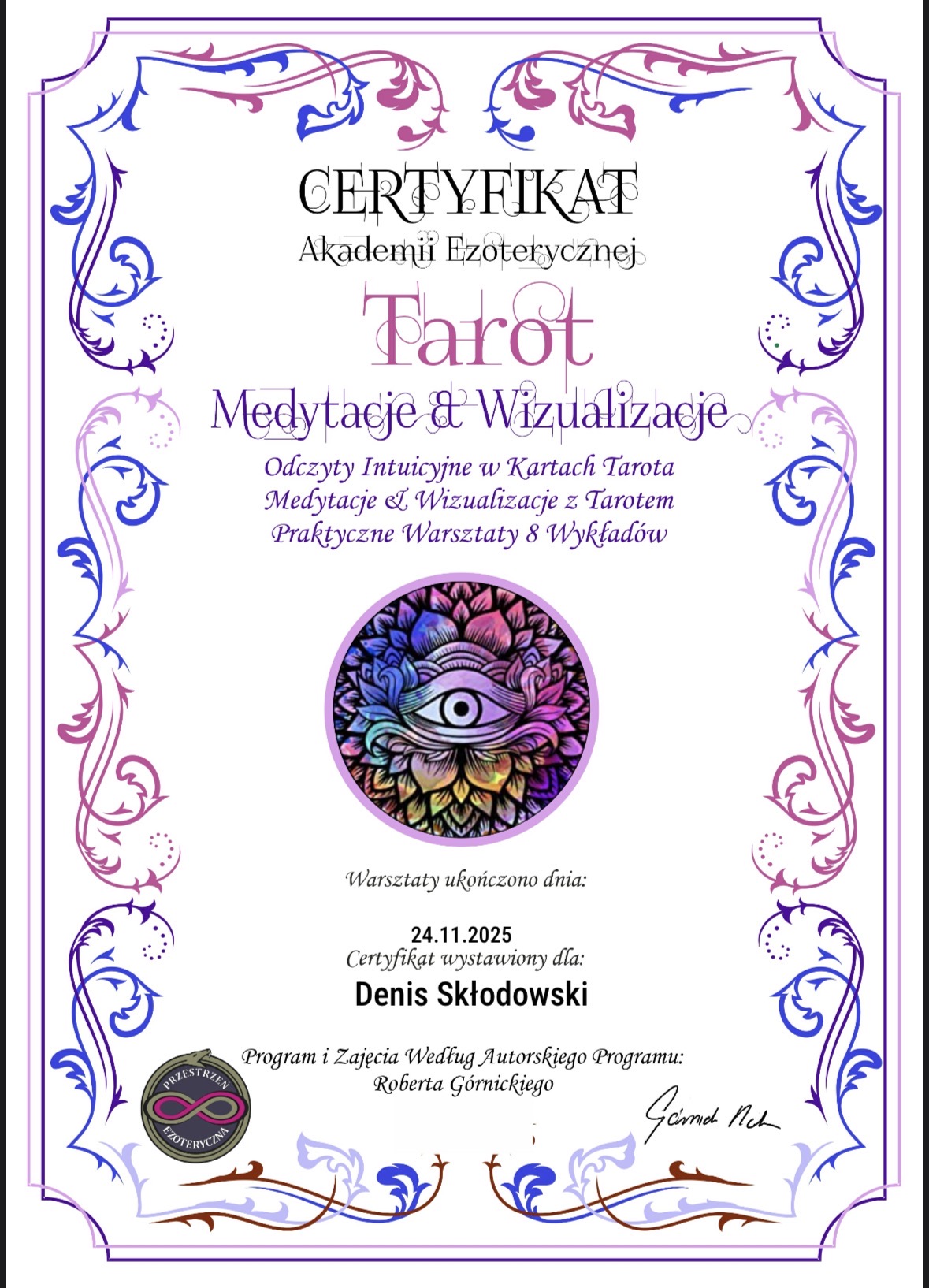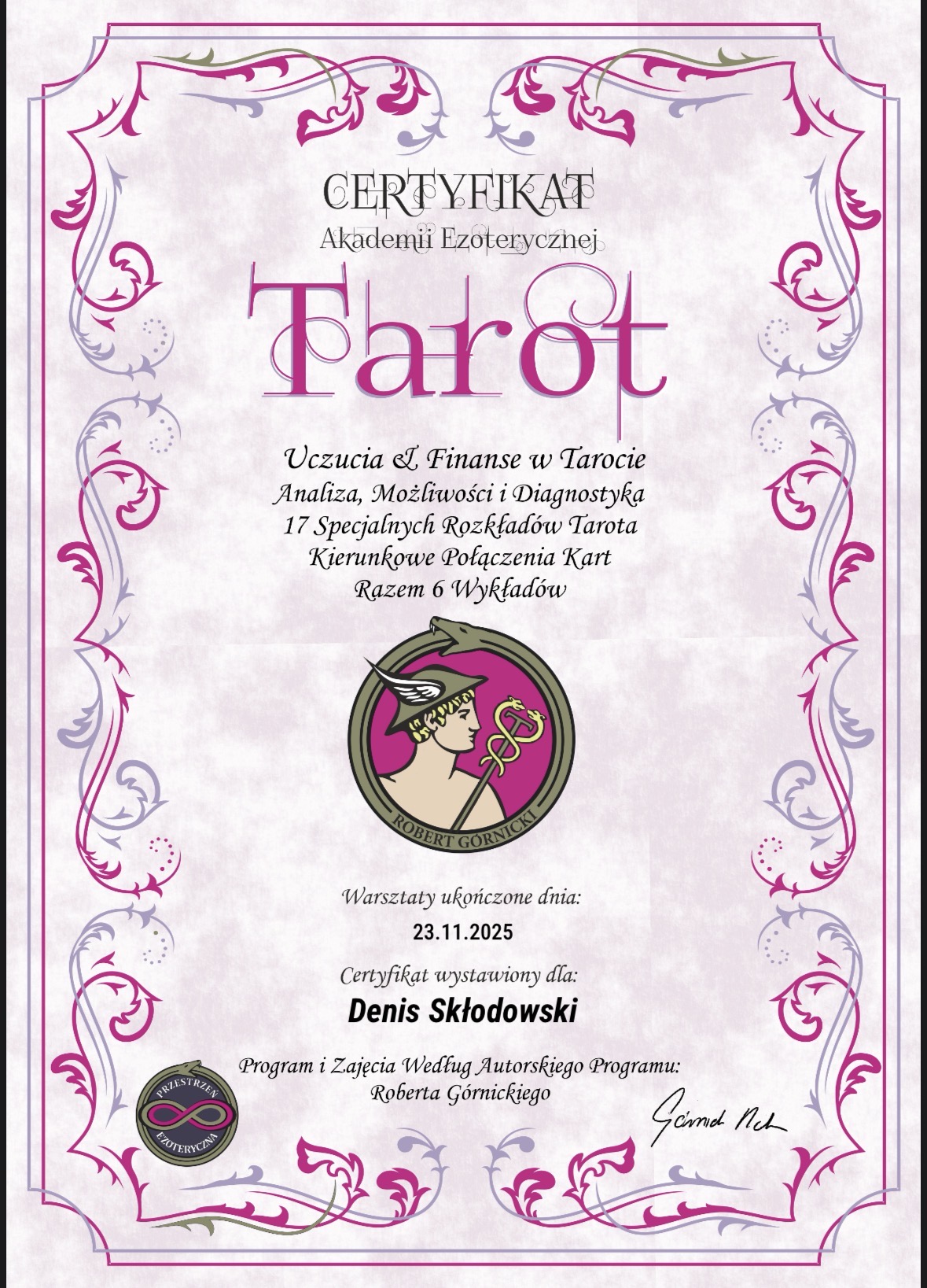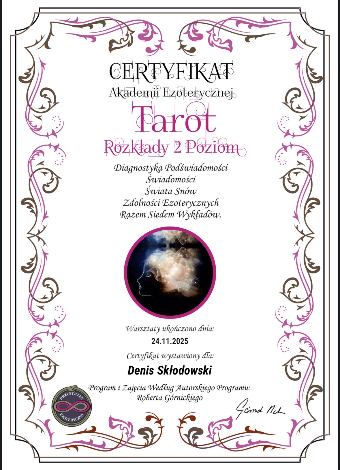 Kartami tarota jak i ezoteryką zajmuję się już 19 lat (wszystko w zakładce: "o mnie"). Jestem samoukiem, jednak przyszedł w końcu czas w 2025 roku na zdobycie oficjalnie certyfikatów oraz poszerzenie swojej wiedzy poprzez uczęszczanie na kursy ezoteryczne. Certyfikaty poniżej: